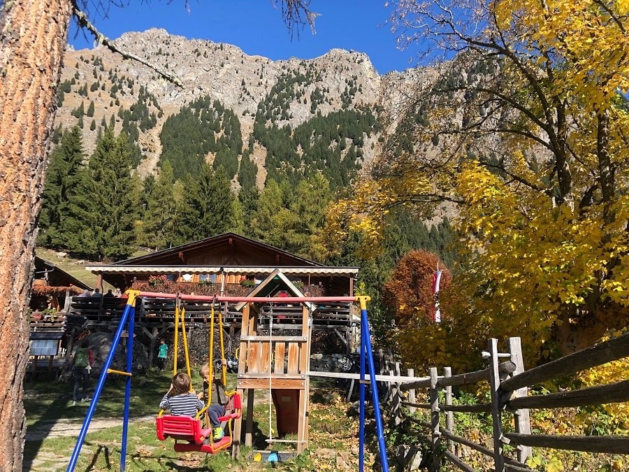Se avete bambini piccoli vi potete fermare nelle prime strutture ricettive: qui sotto l’albergo/ristorante Hochmuth, proprio accanto all’arrivo dell’impianto, con sdraio e una divertente carrucola portatutto che i vostri bambini noteranno subito all’arrivo.