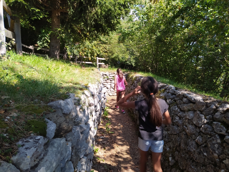 La prima tappa del nostro giro sono state le trincee della Grande Guerra. Dopo aver legato gli asinelli ad un albero siamo scesi a piedi per qualche decina di metri: le trincee (ben segnalate) includono sia i classici camminamenti che una grande struttura seminterrata, dalla quale è possibile ammirare la valle sottostante che si apre verso il Monte Altissimo ed il lago di Garda.