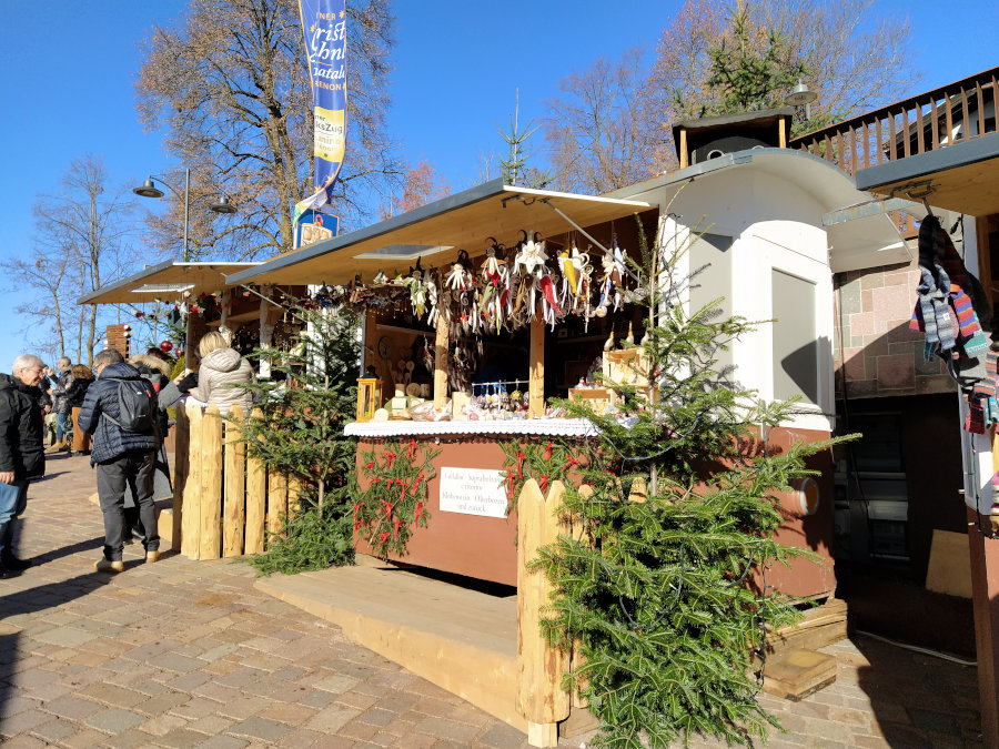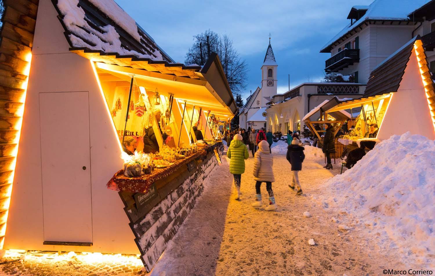 Nei pressi della stazione del famoso trenino si trovano degli originali stand in legno a forma di vagoni. Oltre alle specialità culinarie, fanno bella mostra sulle bancarelle tanti prodotti con una lunga tradizione artigiana alle spalle: presepi di legno, angioletti, pantofole, accessori di cuoio, il profumato cirmolo, oli e candele, gioielli, cappelli e decorazioni. Qui si possono incontrare anche i lama: morbidissimi da accarezzare!