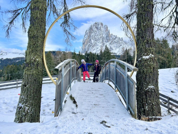 Poco dopo si incontra un grazioso ponte in legno con un grande cerchio dorato che incornicia alla perfezione il Sassolungo (immagine di copertina). Lungo il percorso incontrerete altre aree di sosta che permettono di godersi il panorama circostante sui gruppi montuosi Stevia, Sassolungo, Seceda, Sella e sull’abitato di Santa Cristina.