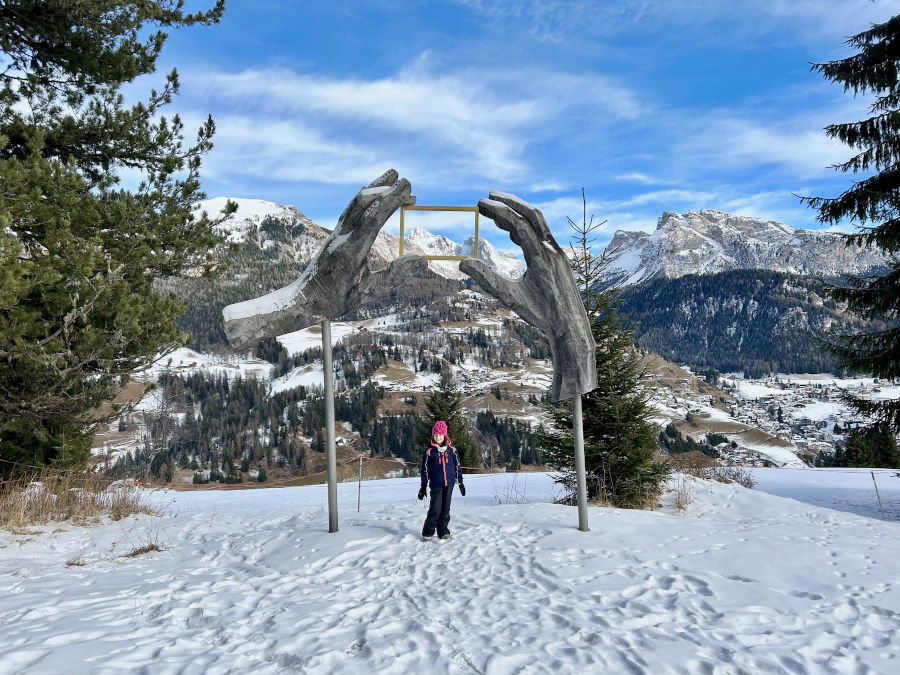 Una bella passeggiata panoramica di circa un’ora che si affaccia sulle vette più belle della zona. Il percorso ad anello di un chilometro e mezzo, è pianeggiante e adatto anche ai piccoli camminatori. Ad ogni tappa è possibile ammirare le opere realizzate da artisti locali con citazioni e frasi di grandi personaggi della storia. Incontrerete mani che racchiudono cornici, radici che affondano nelle nuvole, piume giganti infilate nella neve…