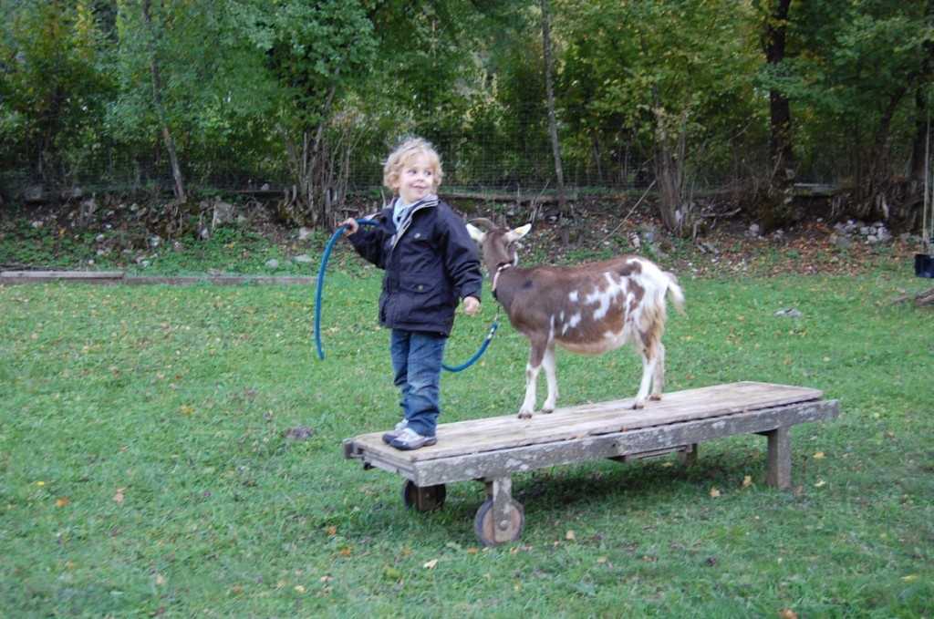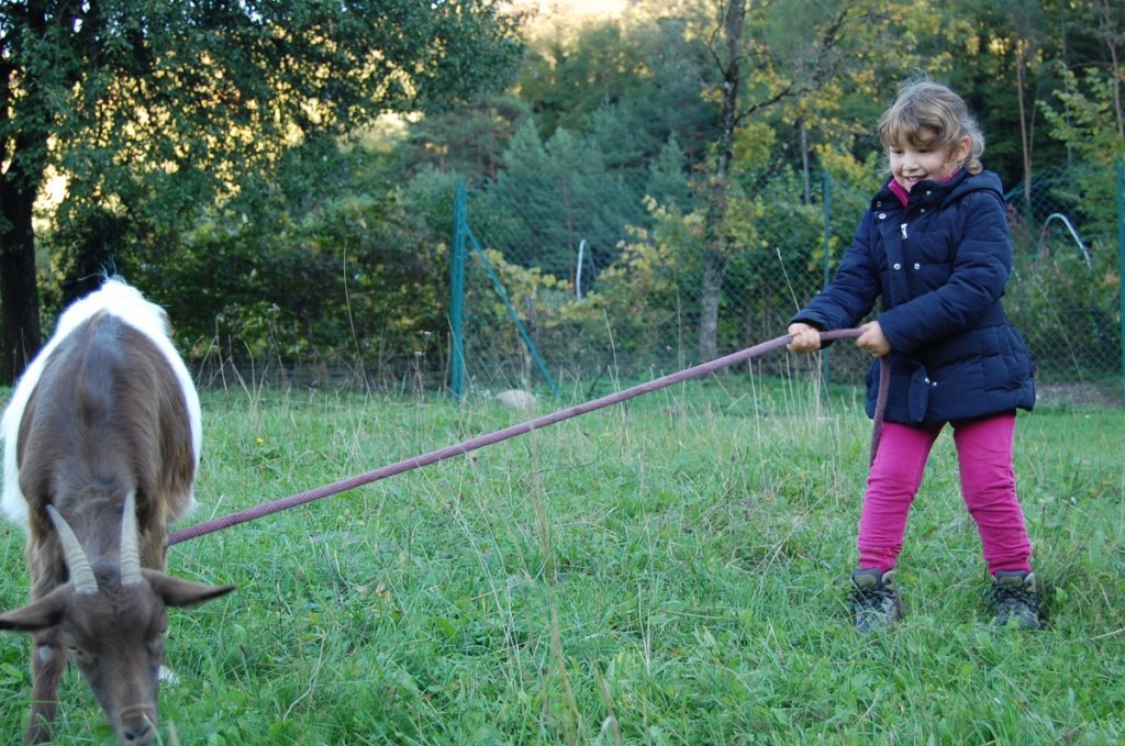 Leonella ci ha portato poi dalle pecore, che abbiamo “guidato” quasi fossimo dei cani da guardia del gregge, ma il pezzo forte è stato il trekking con le capre. Ogni bambino aveva la sua, accanto alla quale doveva camminare su una bella strada forestale nel bosco. Non vi dico le risate. perché le capre sono davvero difficili da domare e i bambini sono più corsi dietro alle loro esigenze che capaci di farsi obbedire.