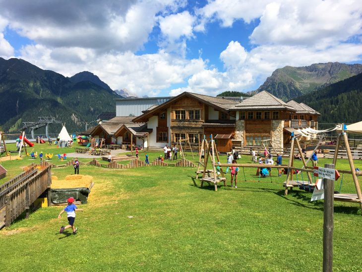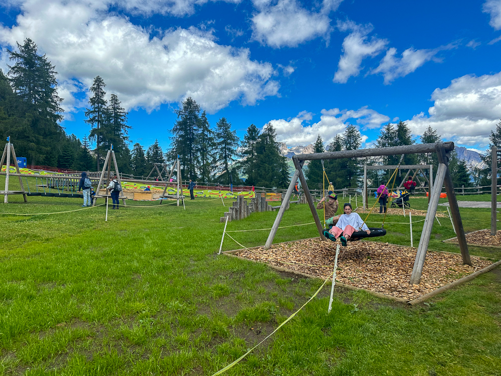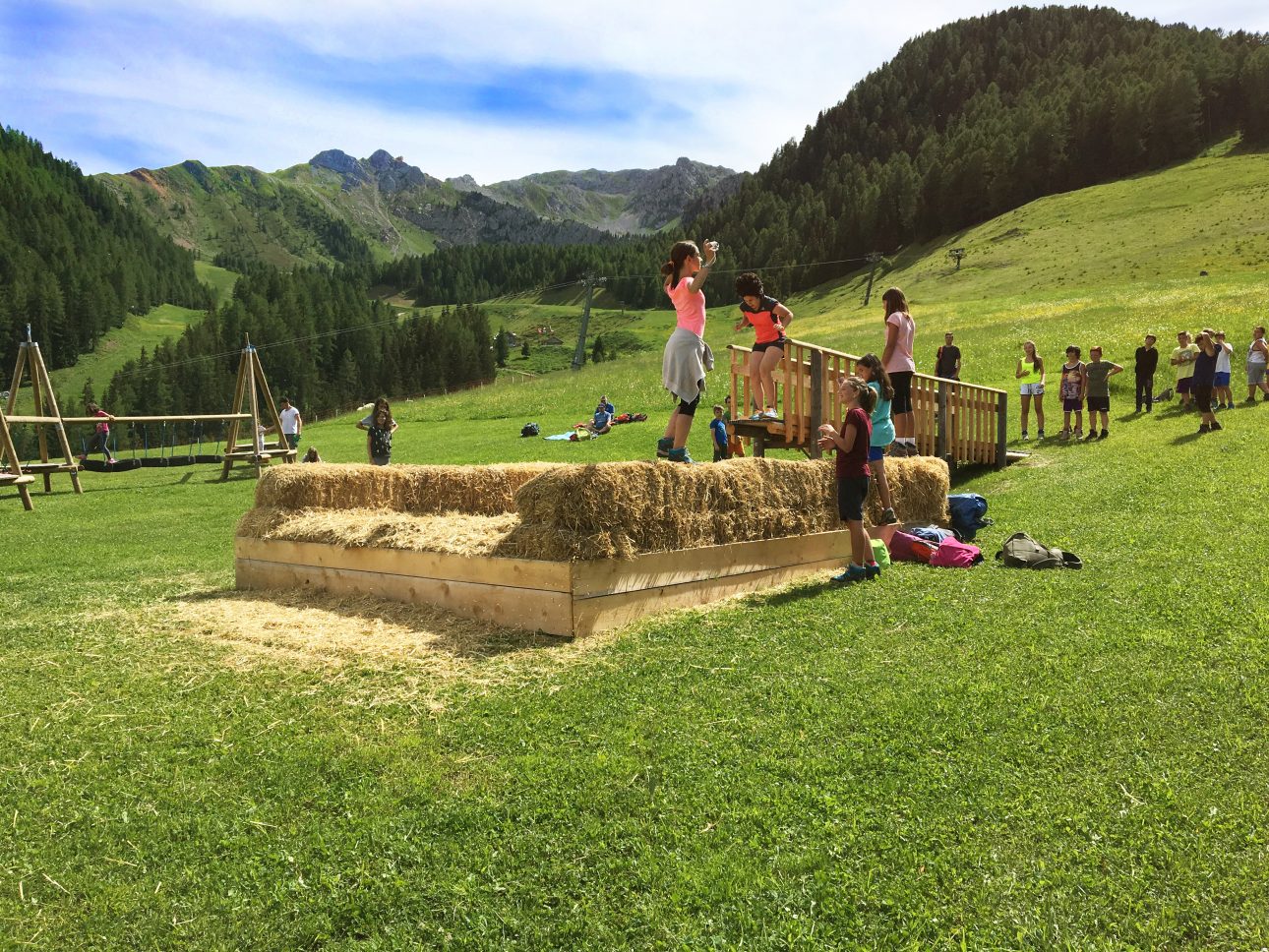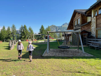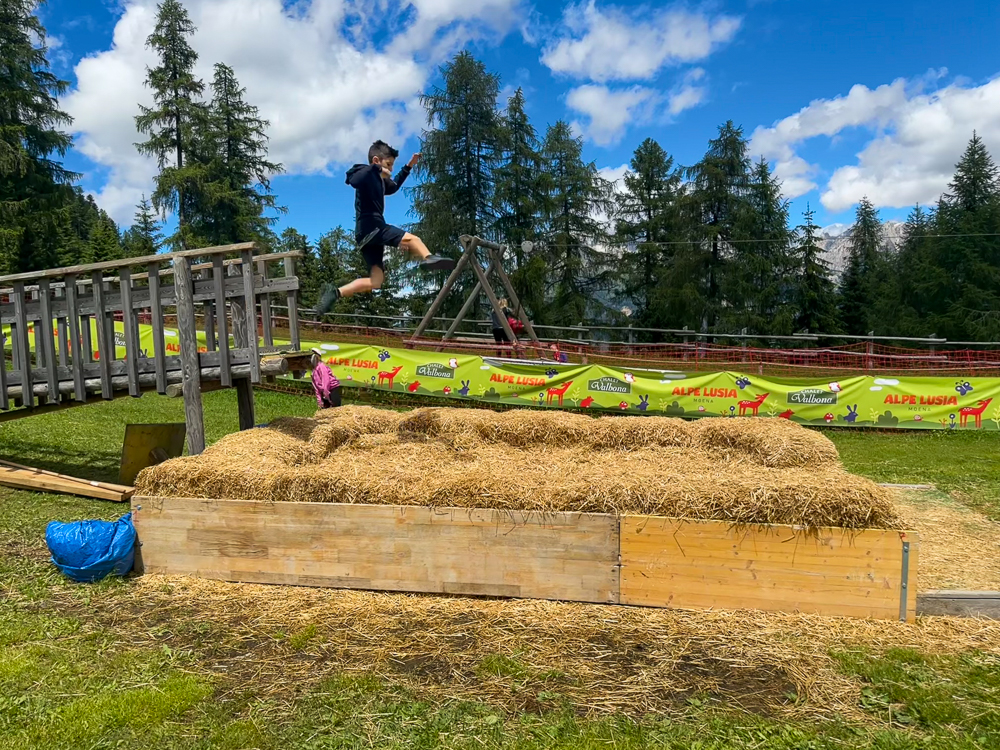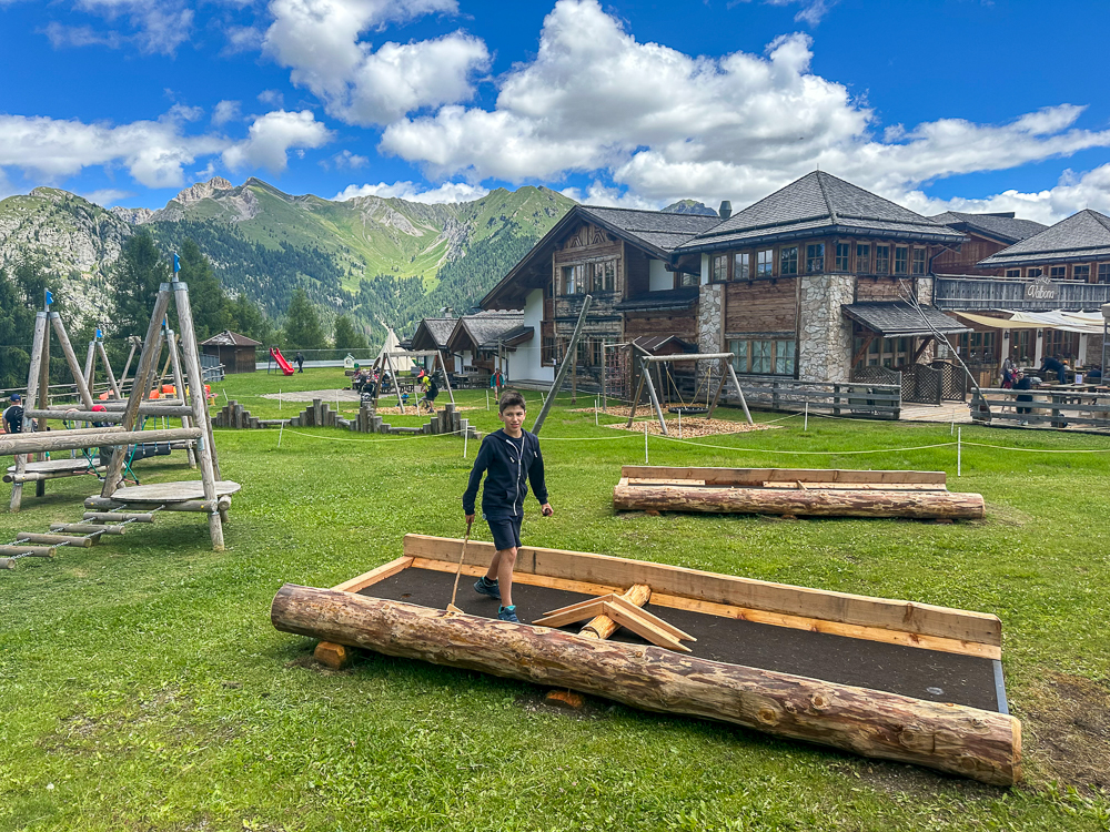 È proprio nel giardino del rifugio che si trova il grande parco giochi dotato di slackline, percorsi sospesi, teleferica, il mitico salto nel fieno, il laghetto con i girini…