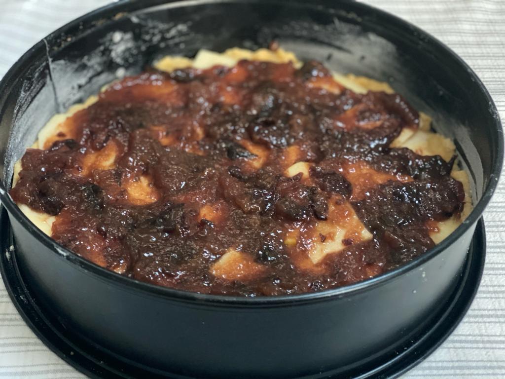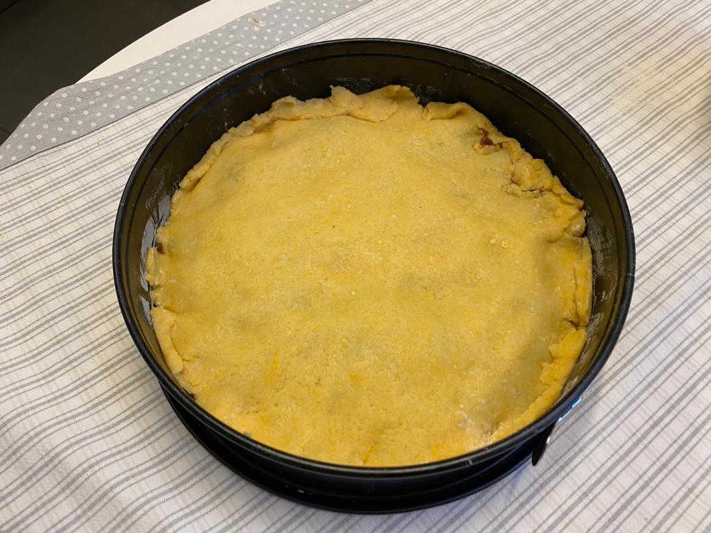 La parte della pasta che non abbiamo ancora utilizzato va stesa e posizionata sopra la marmellata, magari utilizzando la carta forno inumidita o infarinata per aiutarvi nell’operazione.