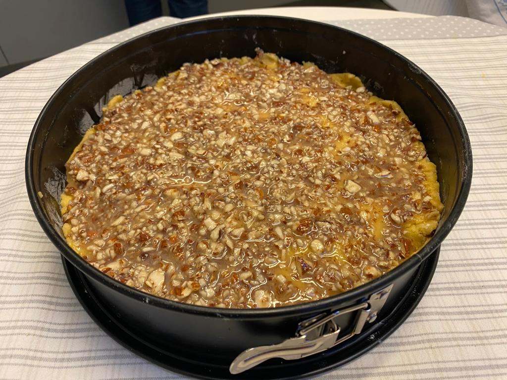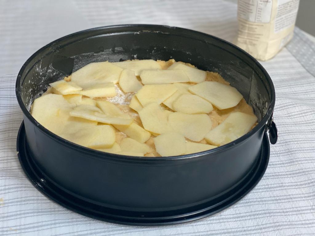 Unire tutti gli ingredienti per l’impasto (farina, lievito, uova, burro, zucchero) e mescolare con la spatola o con il robot, in quanto si tratta di una pasta frolla. Una volta che la pasta è pronta tagliarne poco più della metà e con cui ricopriremo la teglia (di 28 cm circa, non più piccola), che avremo già imburrato e infarinato. Un consiglio: se vi accorgete che l’impasto ha necessità di altri liquidi aggiungere un altro albume oltre a quello consigliato. A questo punto possiamo tagliare la mela direttamente sopra la pasta nella teglia, a fettine sottili, per ricoprirla con uno strato.