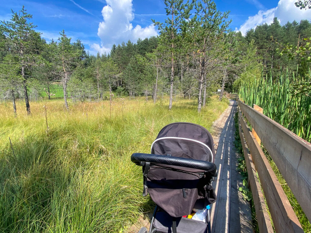 Il percorso ha un dislivello minimo e perciò è adatto anche a piccoli camminatori, invece non è accessibile con il passeggino per i diversi punti da percorrere nel bosco. Il paesaggio è incantevole e regna un’incredibile quiete. Distese di prati infinite, qualche laghetto e lungo la strada diversi masi di montagna con ampi recinti, profumate cataste di legna e animali che pascolano liberamente. Abbiamo incontrato diverse mucche che si godevano il meraviglioso paesaggio, in compagnia di un grosso bue.