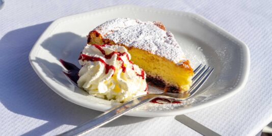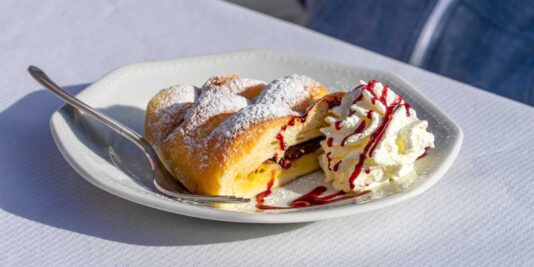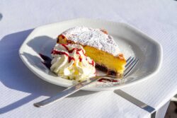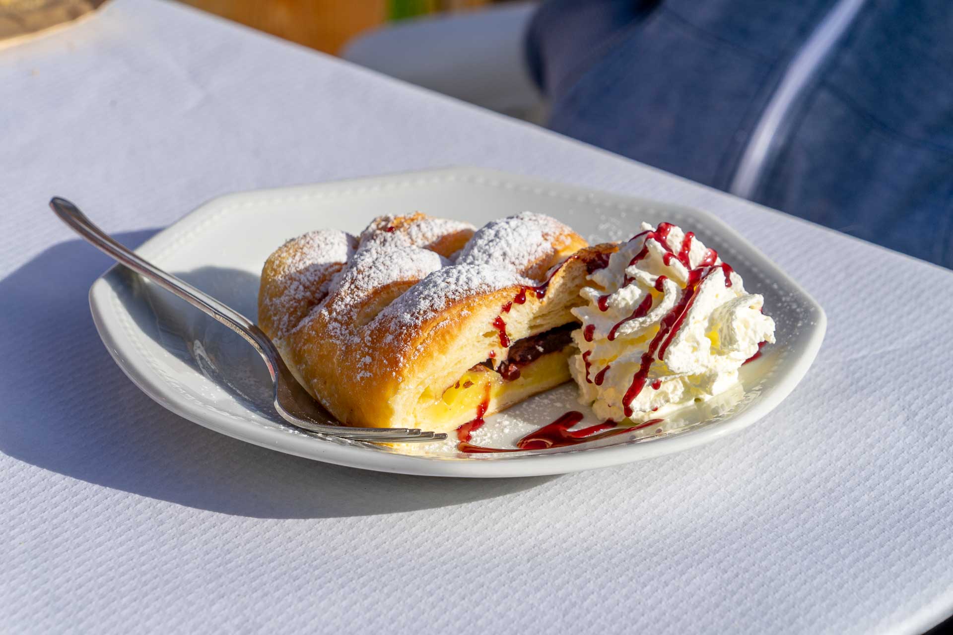 Abbiamo chiuso infine la nostra deliziosa esperienza con una bella fetta di torta di ricotta e mirtilli e una fetta di treccia mochena, realizzate con burro fresco di malga e marmellate di loro produzione.