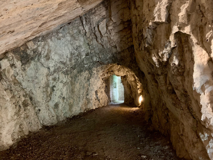 Un labirinto di gallerie e camminamenti, che salgono, scendono e si dipanano in mezzo al verde fino alla grande croce bianca in cima al dosso. Qui si apre un bellissimo panorama! Il lago di Ledro si mostra in tutto il suo splendore e l’intera valle si lascia rimirare da ogni angolazione.