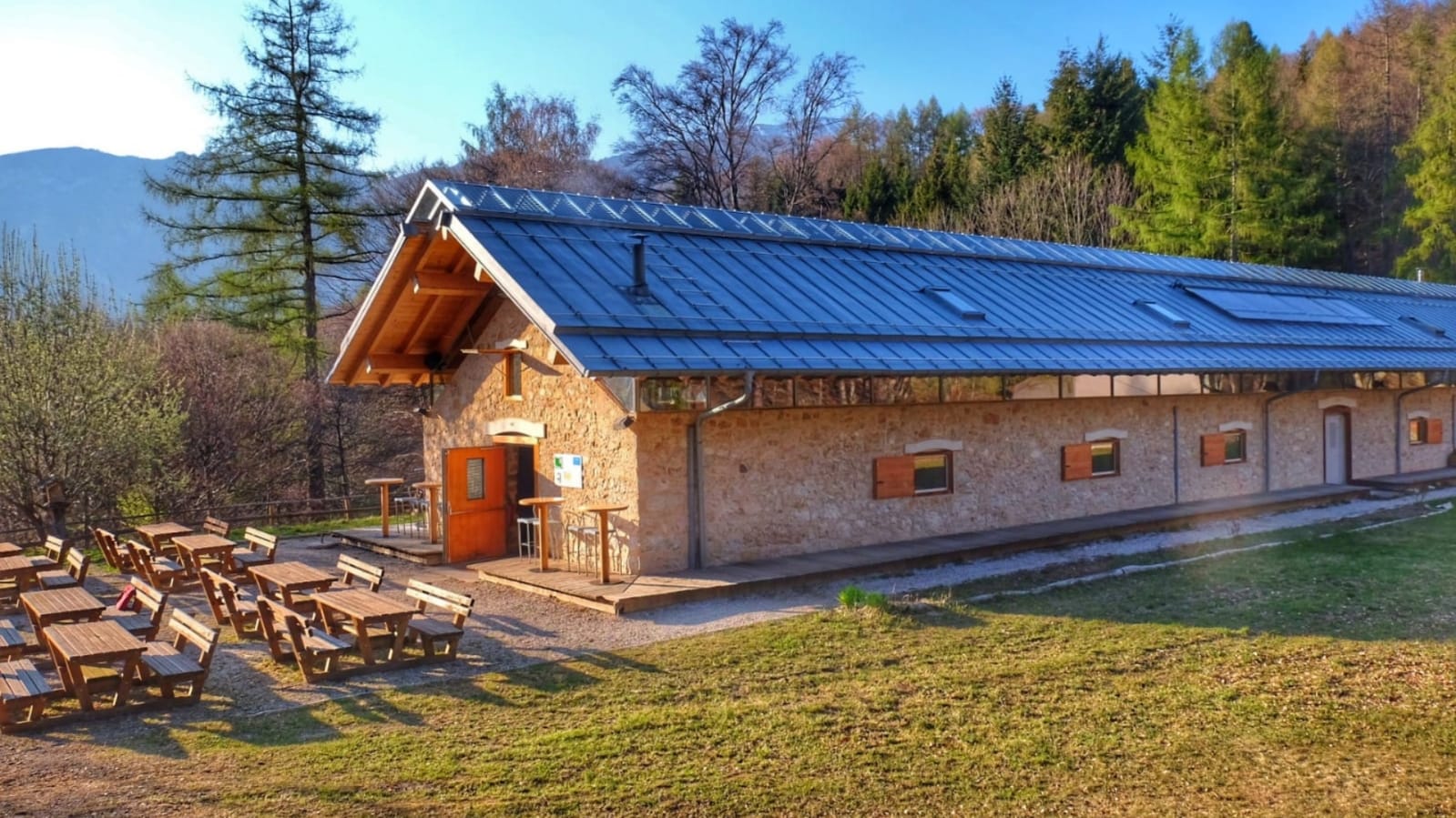 Malga Cimana è un’ampia struttura in pietra che offre sia un caratteristico ambiente interno dove pranzare, sia tavoli all’esterno se volete invece approfittare della bella giornata.