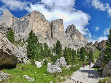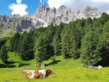 Arrivati lassù, davanti a quella meraviglia che è il gruppo montuoso del Catinaccio, prendete la strada per il rifugio Gardeccia: in 40 minuti di passeggiata nel bosco – praticamente piana e percorribile anche con un passeggino da trekking – arriverete alla meta, tra mucche che pascolano tranquille nei prati, baite e ristoranti tipici, panorama sempre suggestivo.