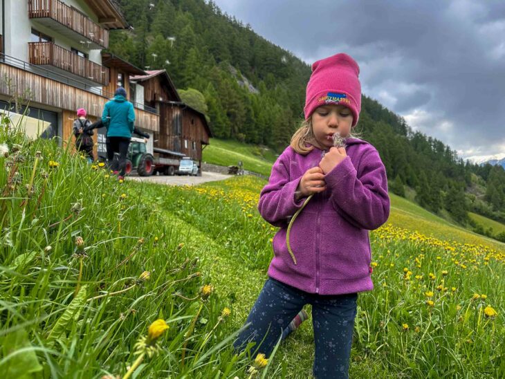 Il maso non prepara la cena, ma potete andare a mangiare la sera a Slingia, a pochi minuti di macchina, oppure prepararla direttamente lì. Ricordate che al maso si possono acquistare i prodotti loro (formaggi, affettati, uova, marmellate, tisane…) e degli altri masi o comunque prodotti locali come vino, miele e altro.