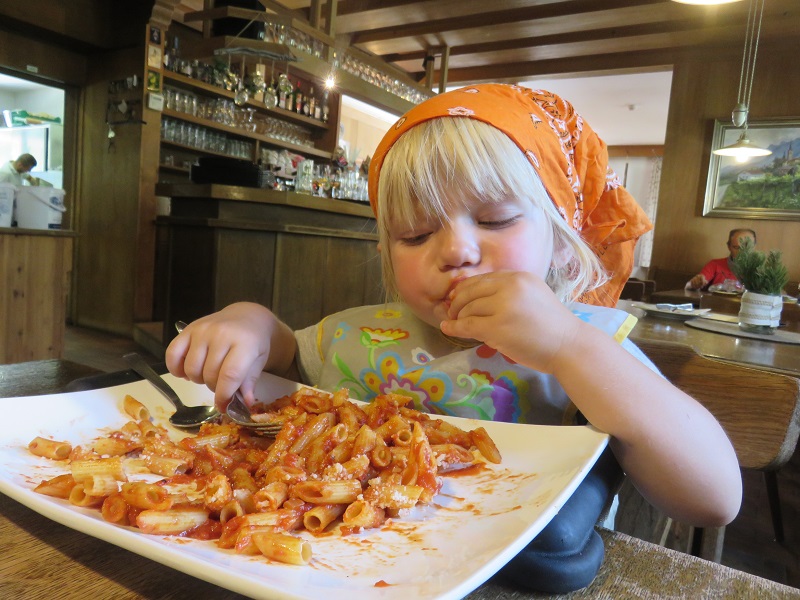 Il rifugio è ormai diventato anche una meta classica per i buongustai. I piatti che abbiamo visto uscire dalla cucina erano abbondanti, ben presentati e molto molto invitanti. Purtroppo noi ci eravamo già organizzati per pranzare al sacco, ma Bianca si è gustata comunque il suo bel piattone di pasta!