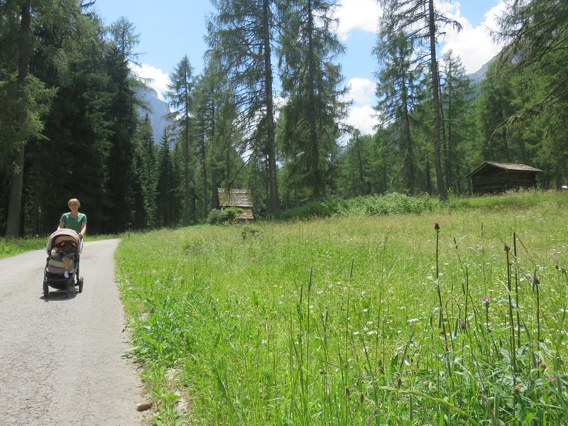 Da qui al Rifugio impiegherete una ventina di minuti circa, l’ideale se avete con voi piccoli camminatori inerba. Nei rimanenti periodi dell’anno potrete invece arrivare con l’auto fino al parcheggio intermedio e proseguire a piedi per circa 4 chilometri (un’ora di cammino). Noi, dato che avevamo Bianca in passeggino, abbiamo scelto di prendere il bus navetta all’andata e poi siamo scesi a piedi fino al parcheggio al ritorno (in meno di un’ora e trenta sarete alla vostra auto).