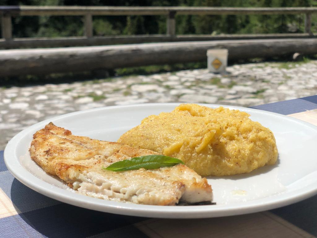 In tavola non mancano i piatti tipici della tradizione trentina: canederli, strangolapreti, polenta con formaggio e funghi, capriolo, goulash, crauti, salsiccia e tanto altro, ad esempio la carne salada e fasoi. Su richiesta possono venir preparati anche piatti particolari come la polenta concia, condita con formaggio, burro e pezzi di salsiccia. A noi è piaciuta molto la polenta con il salmerino alpino.
