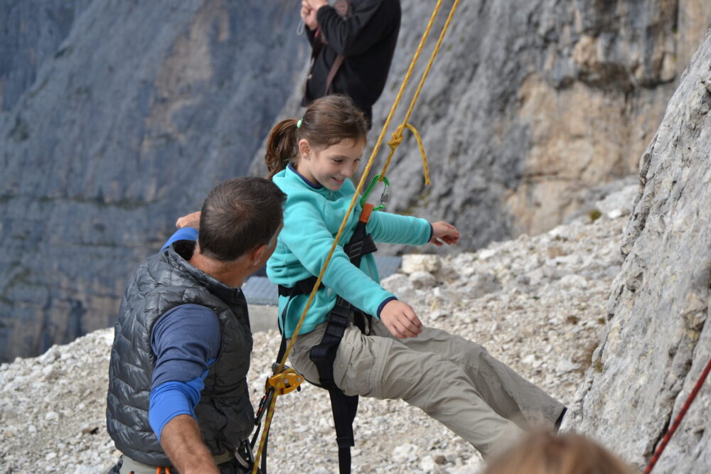 Ore 8.30 – Zaino in spalla, si parte! Breve escursione (circa 30 minuti) con le guide alpine per scoprire le pareti di roccia dolomitica che saranno la palestra per un piccolo ma intenso corso di arrampicata dedicato ai bambini ma anche agli adulti che avranno voglia di cimentarsi in questa affascinante disciplina. Ma prima di partire è bene imparare alcune regole di sicurezza che in montagna è sempre bene ricordare.