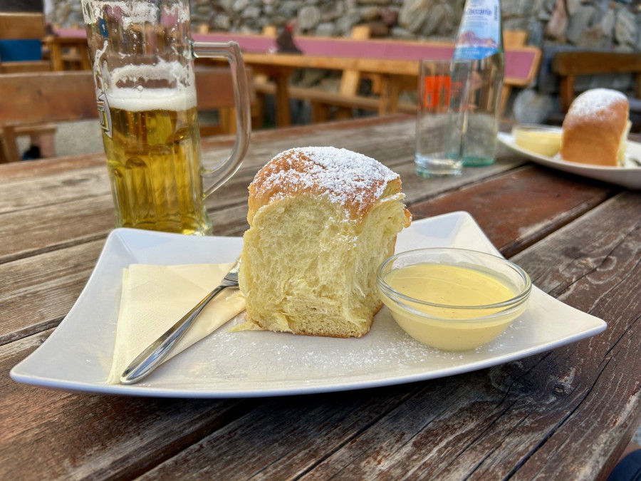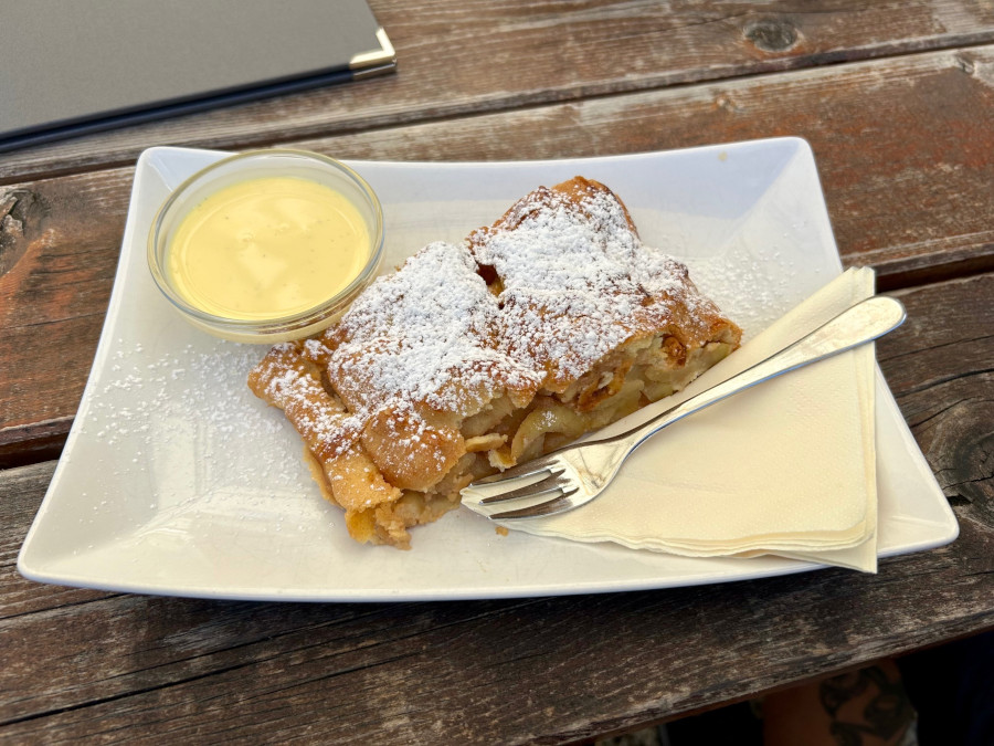 La malga è piccolina e conserva l’autenticità di una volta, pochi tavoli sia all’interno che all’esterno. Per noi un’ottima merenda con una fetta gigante di strudel accompagnata da salsa alla vaniglia e buchteln, dolci tipici tirolesi di pasta lievitata farciti con marmellata all’albicocca.