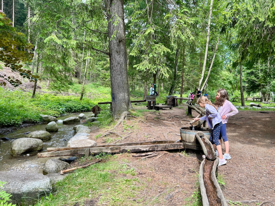 Optiamo per il sentiero più semplice e torniamo sui nostri passi per proseguire la camminata sulla forestale. Una cinquantina di minuti per arrivare alla meta, con qualche sosta per ammirare e raccogliere qualche sasso che brilla al sole. Molto carino anche il piccolo rio che accompagna l’intera passeggiata e regala un po’ di frescura. In alcuni tratti anche delle piccole cascatelle che divertiranno molto i più piccoli.