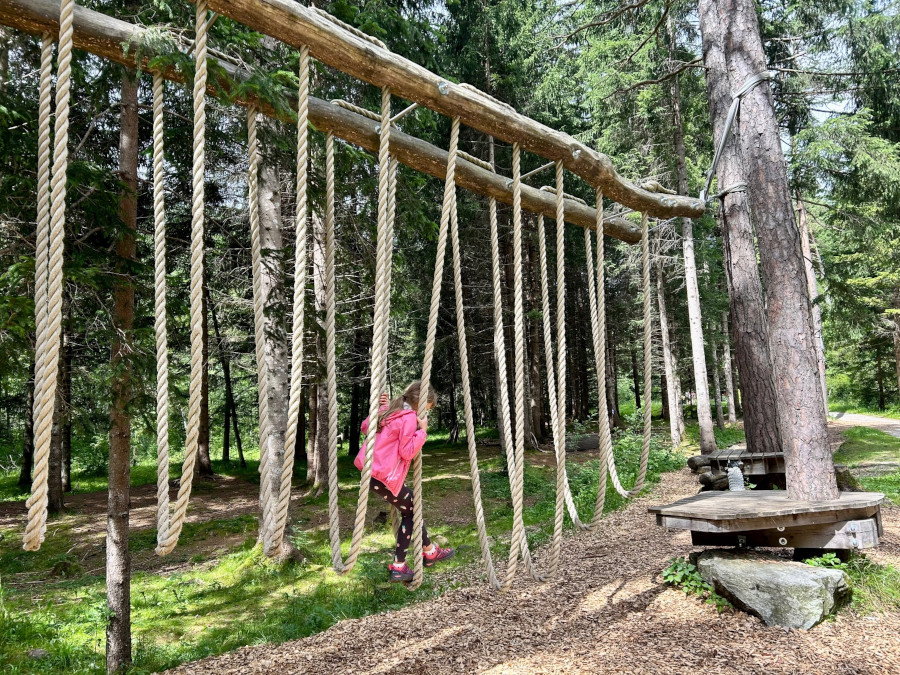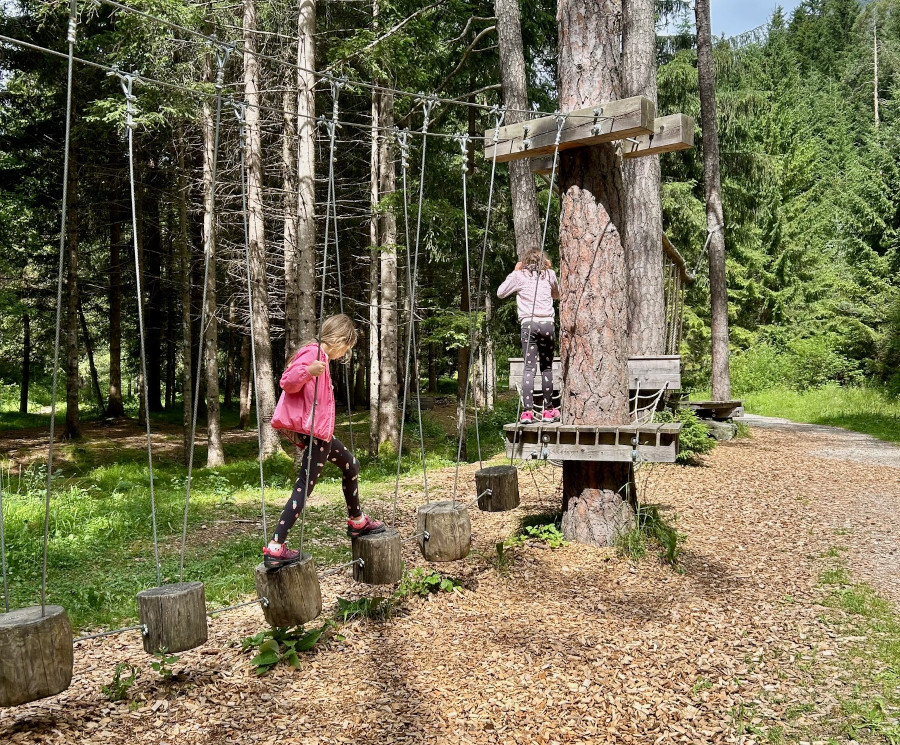 La grande piattaforma in legno è l’inizio di un lungo percorso d’equilibrio. Davvero molto bello, si alternano corde, reti e ponti traballanti. Concludono due divertenti teleferiche.