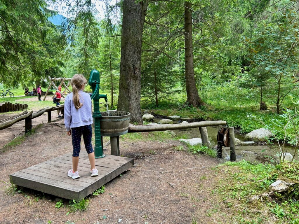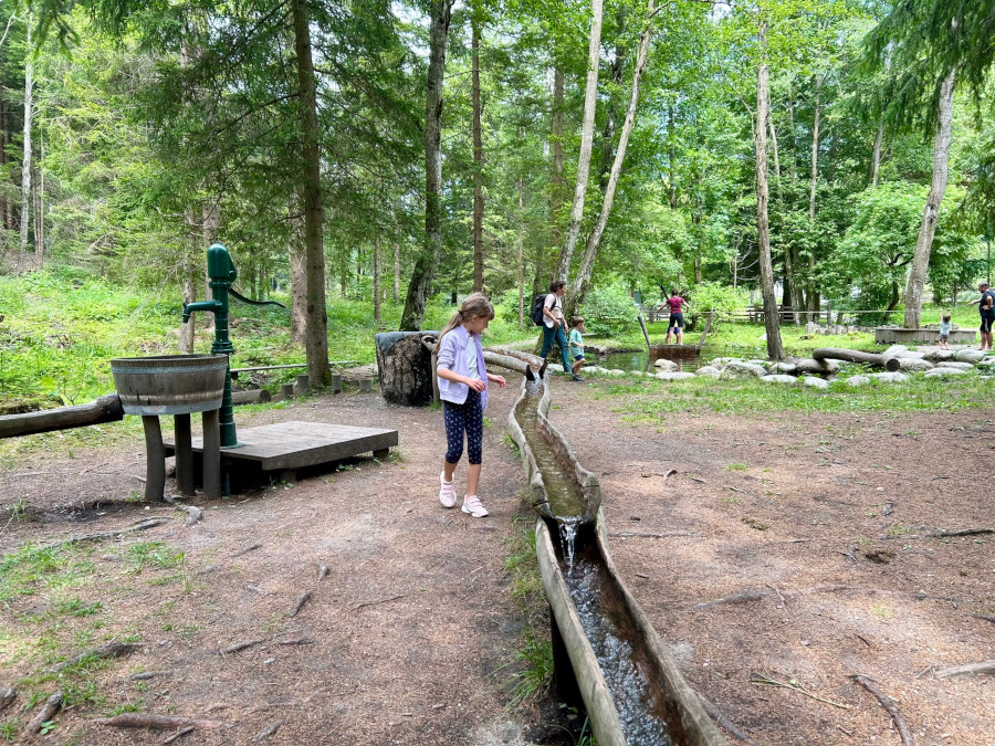Il rio è attrezzato con dighe, canali e tinozze, mulini alimentati da pompe idrauliche per divertirsi a più non posso con l’acqua! Il parco è dotato anche di un percorso Kneipp e altalene.