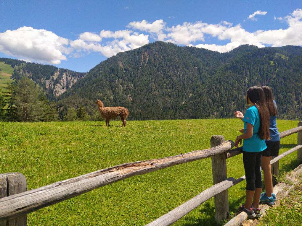 Fatta questa necessaria premessa vi raccontiamo la nostra esperienza. Salendo da San Martino lungo i tornanti si arriva fino a Ciastel De Tor, sede del Museo Ladino. Impossibile sbagliare: il castello spicca in mezzo al verde dei prati. Qui si può parcheggiare l’auto in uno dei due parcheggi coperti. Si sale poi a piedi per circa cento metri lungo la strada principale: nel campo sulla destra solitamente si vedono dei lama al pascolo, che ovviamente non potevamo non fermarci a salutare…