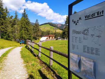 Sempre sulla destra si trova l’ingresso del percorso SMACH- Val dl’Ert, dove è possibile prelevare gratuitamente dall’espositore una mappa e fermarsi a leggere un po’ la storia e la filosofia del parco. Il parco è sempre aperto, ad ingresso libero, ed è diviso in cinque diversi settori. Si snoda su un terreno per lo più pianeggiante o con lieve pendenza, ma nel tratto intermedio presenta una ripida e stretta discesa (se pur di poche decine di metri) per questo non è adatto ai passeggini.
