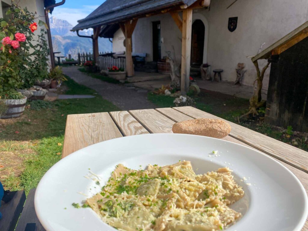 Nel menù i piatti della tradizione altoatesina. Scelta giusta, che secondo noi è garanzia di cura ed attenzione per la preparazione e le materie prime: taglieri di speck e formaggio, salsiccia e crauti, minestra d’orzo e omelette con formaggio (gigante) o con la marmellata, Kaiserschmarren. Noi abbiamo scelto i ravioli fatti in casa con ripieno di ricotta e spinaci: ottimi.