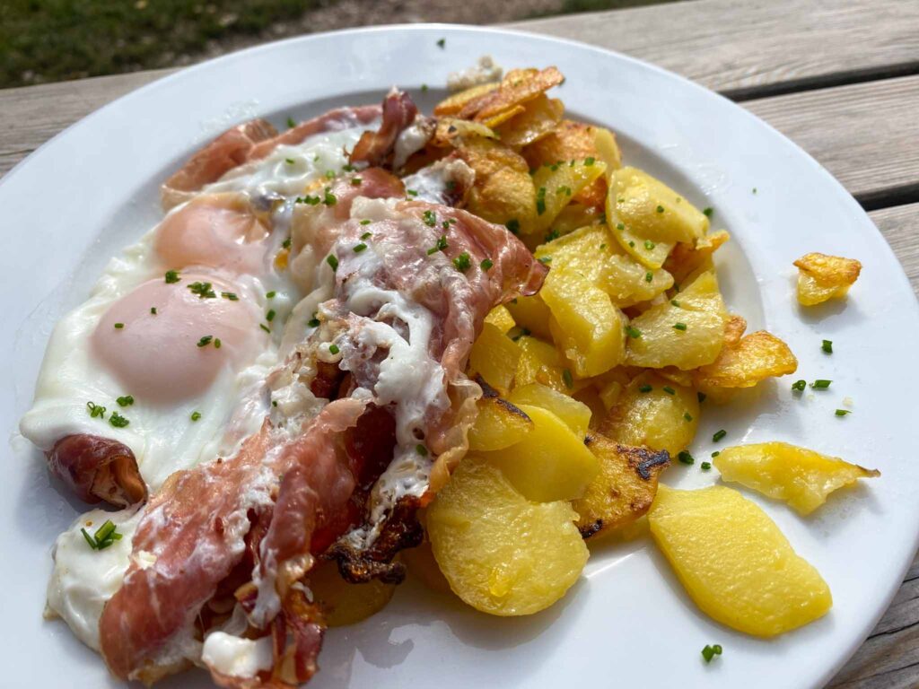 E poi il classico piatto uova, speck e patate arrostite. Buono ed abbondante.