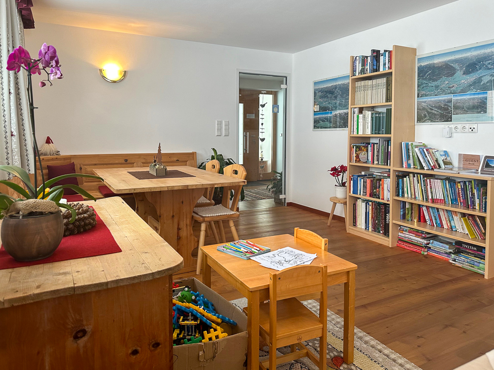 In alternativa si può scendere nella stube, dove ci sono anche dei giochi per i bambini, colori e libri. Uno spazio in comune sempre aperto agli ospiti.