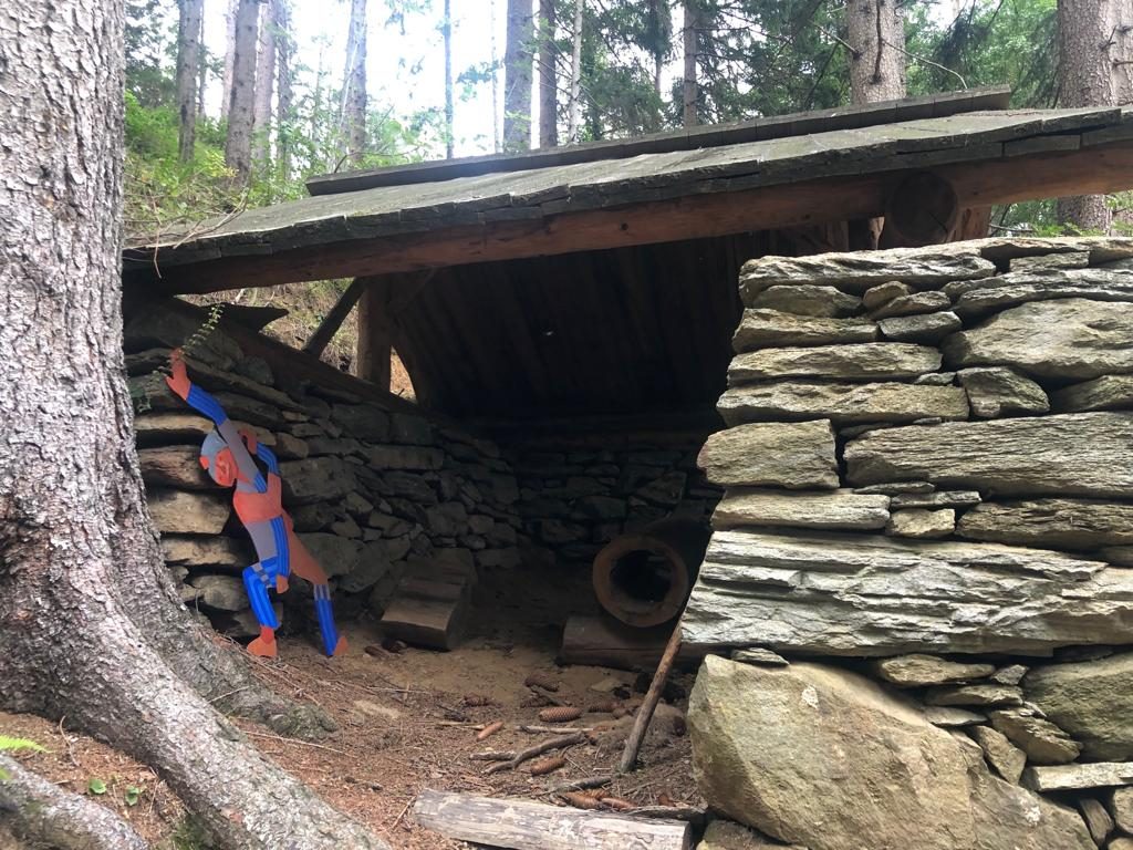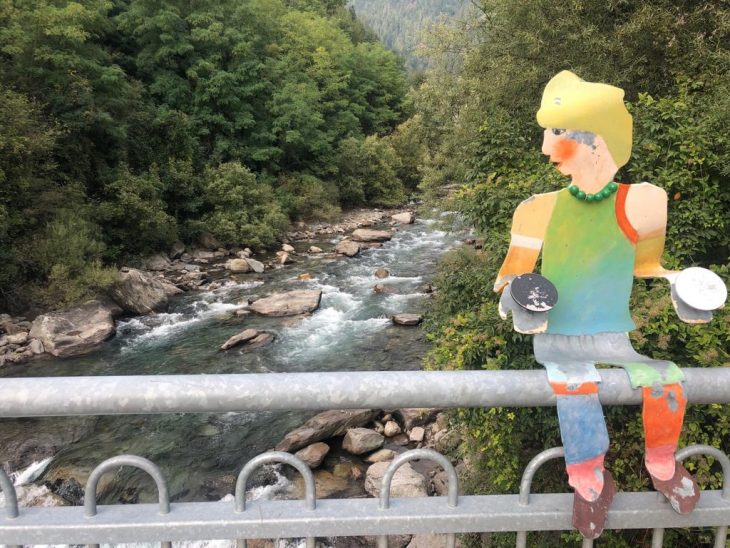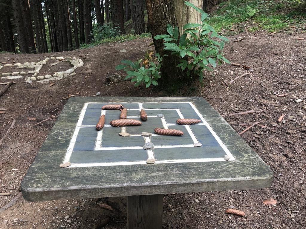 Dopo una mezz’ora circa (e una bella veduta dall’alto sul paesino di San Leonardo) troverete una simpatica area sosta, con installazioni varie, la campana per giocare con i sassi e una “tavola mulino”, o “tria” (foto sotto) che ha come scopo quello di posizionare per primi un tris di pigne o sassi, o qualsiasi altra cosa troviate in natura.