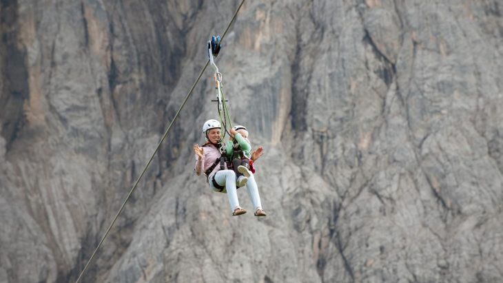 La partenza inizialmente è tranquilla e porterà i passeggeri in breve tempo ad oltrepassare l’inconfondibile pilone, con un sistema unico ed innovativo, da qui la discesa prende velocità arrivando a toccare i 100 chilometri orari, fino all’altopiano del Monte Pana. Una scarica di adrenalina ed emozioni immersi in un paesaggio mozzafiato nel cuore della Val Gardena, un’esperienza da provare assolutamente e alla portata di tutti. La zipline è lunga 1600 metri e ha un’altezza massima dal suolo di 100 metri.